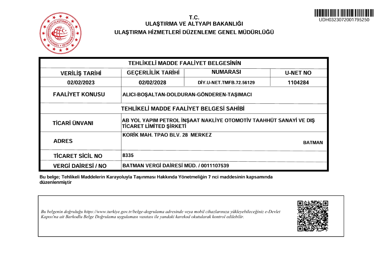 Tehlikeli madde taşımacılığı belgeleri, lojistik sektöründe güvenli taşımacılık için zorunludur. Firmamız, gerekli tüm yetki belgelerine sahiptir ve yasal mevzuata uygun şekilde hizmet sunmaktadır.